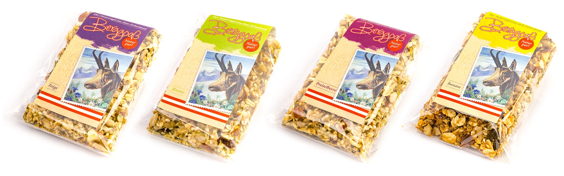 Die „Berggoaß“ ist ein zart, knuspriger Müsliriegel, der mit seinen hochwertigen regionalen Zutaten und seinen 293 kcal, als Kraftspender auf keiner kräftezerrenden Tour fehlen darf.